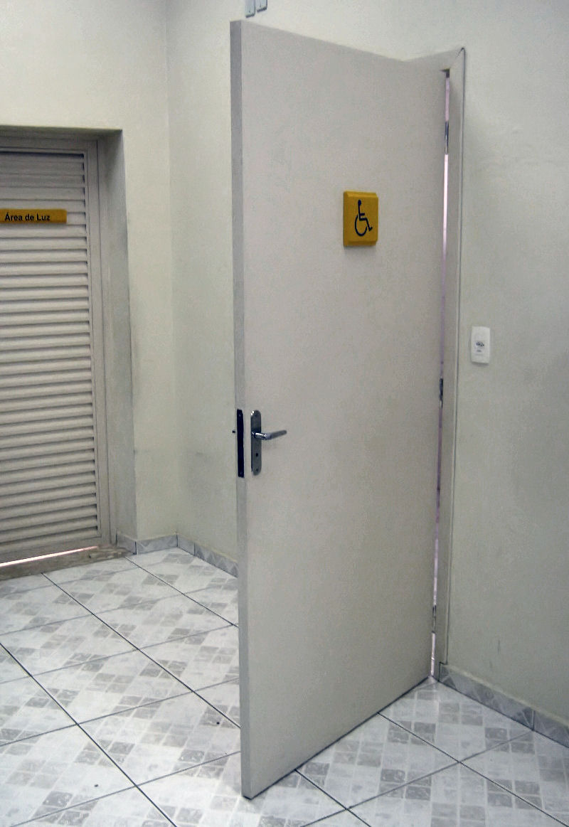 | As portas dos sanitários de acesso universal devem abrir para fora do ambiente e possuir largura suficiente para a passagem de cadeira de rodas ou pessoa portadora de muletas. |